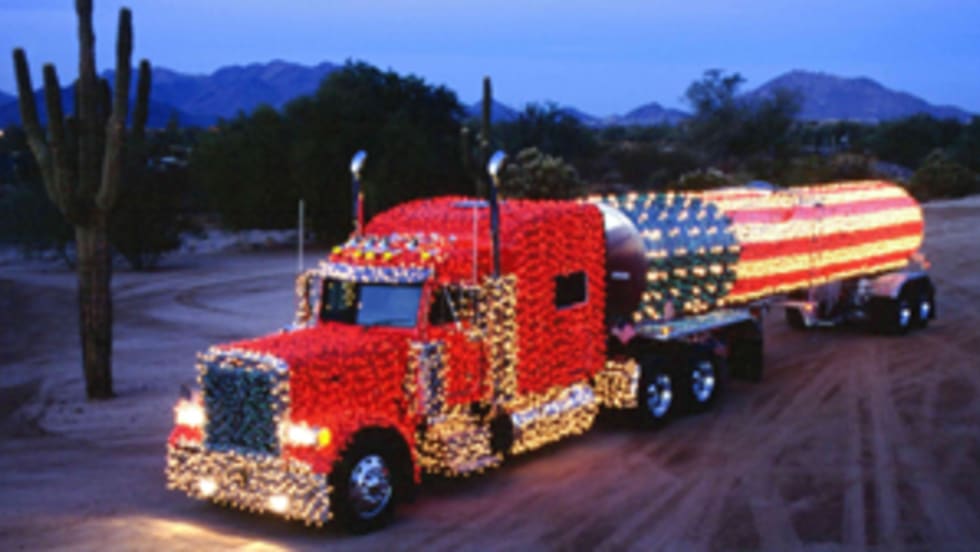 A Peterbilt Model 379 and tanker-trailer with 40,000 red, white and blue lights is visiting Giant Travel Centers throughout the Southwest, giving miniature American flags and American flag lapel pins to the crowds that gather around it