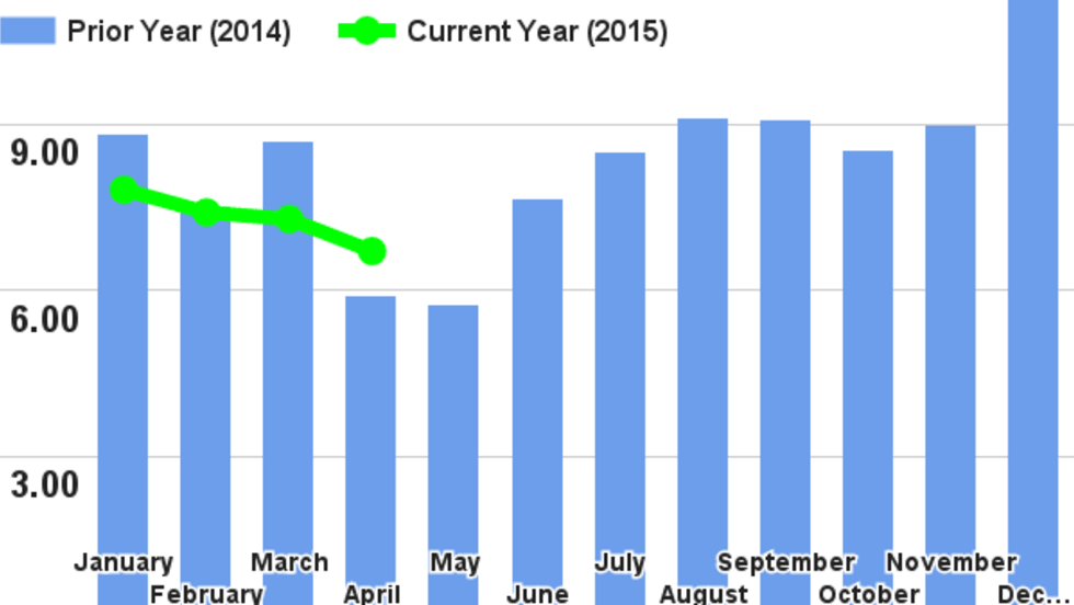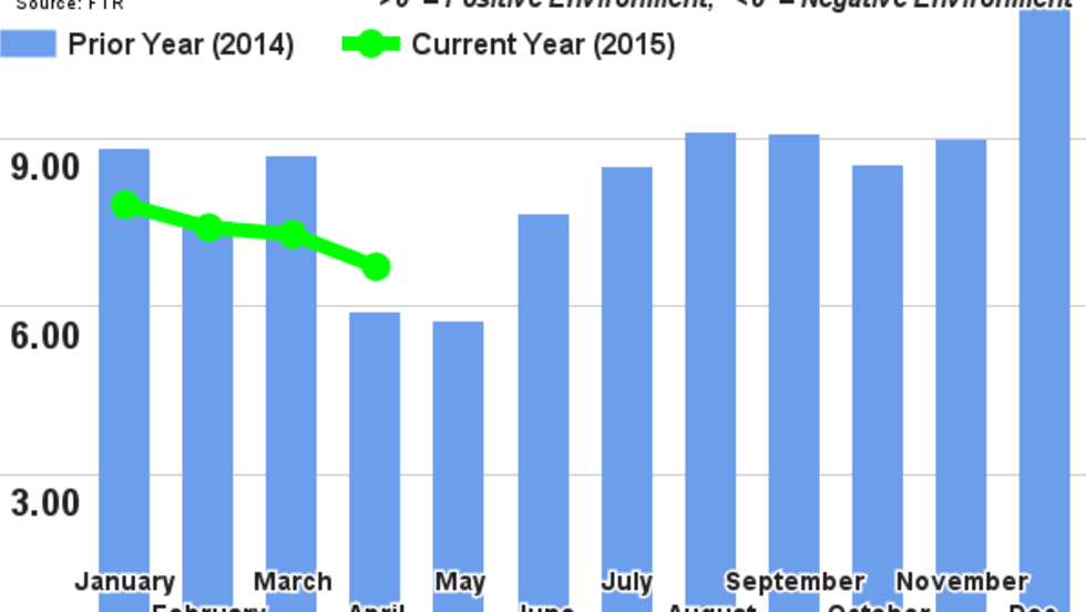 The FTR Trucking Conditions Index fell 9% to a reading of 6.7 in April, weakened by more available capacity and less pressure on rates.