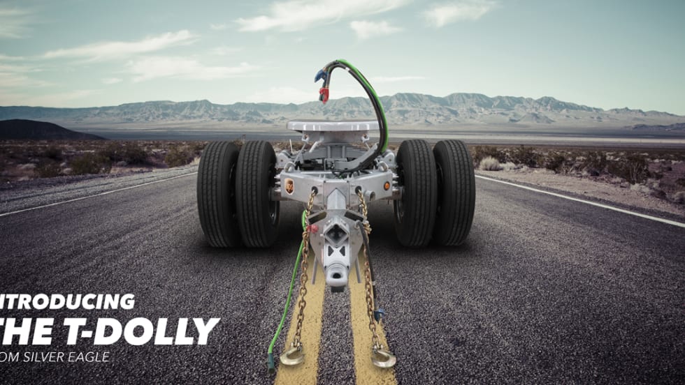 The large gap between combination trailers can now be decreased at highway speeds to reduce aerodynamic drag and save fuel with Silver Eagle Manufacturing’s T-Dolly.