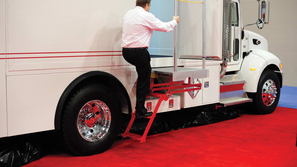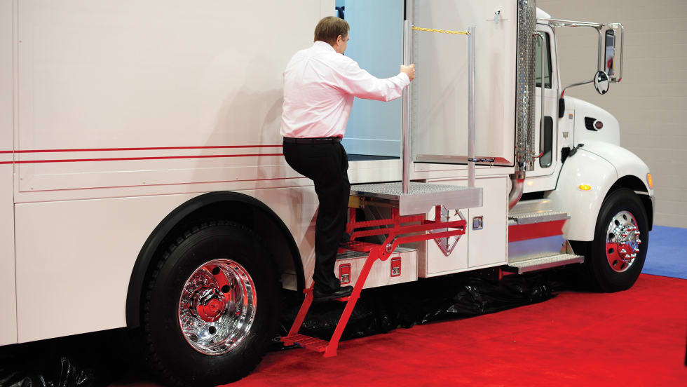Bustin has introduced a sturdy, compact platform and step system that can be mounted on existing equipment. The 28-inch-deep Slide & Go Space Saver Platform fits most truck bodies, including flatbed trailers and vocational trucks.