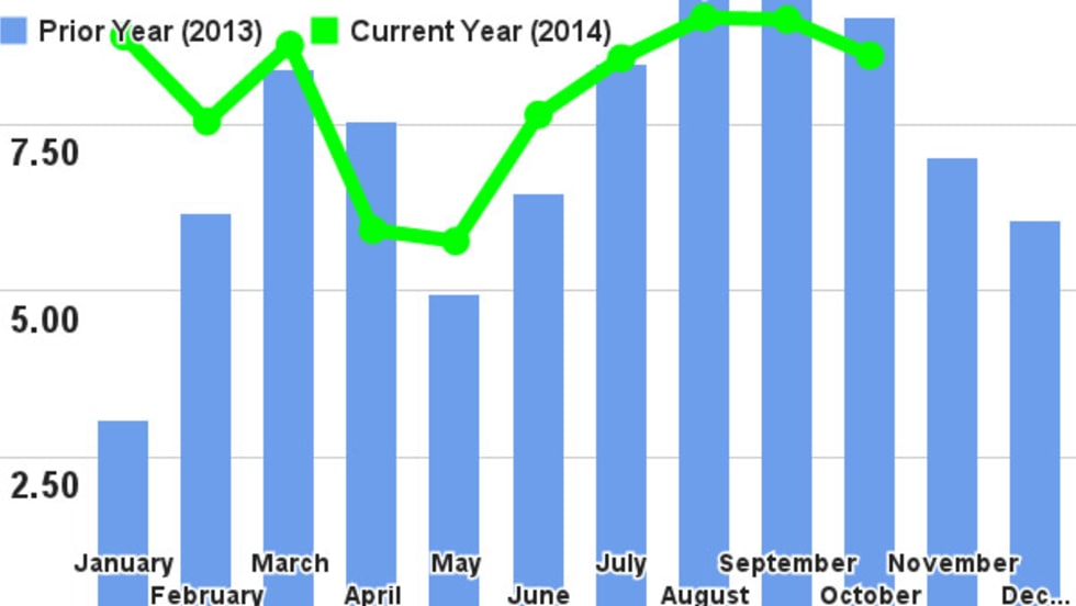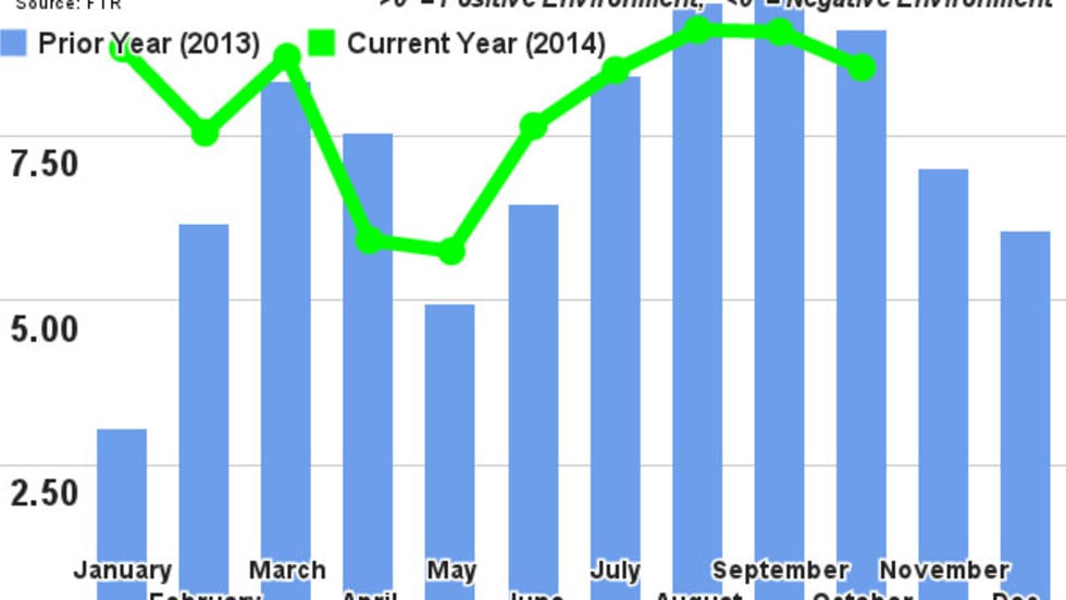 FTR’s Trucking Conditions Index for October, at a reading of 8.53, fell only slightly from September’s level, reflecting still strong fundamentals for trucking companies, and the transportation analysis firm expects it to stay strong through next year.