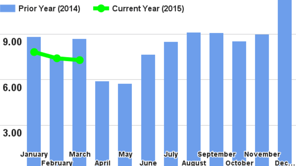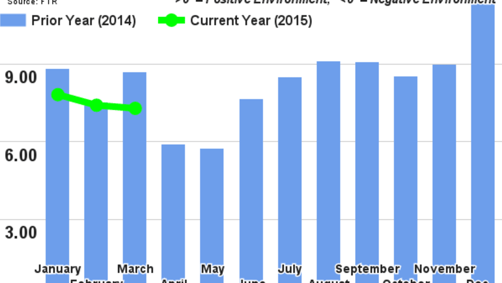 The FTR Trucking Conditions Index fell slightly in March to a reading of 7.3, reflecting lessened demand for truck services and normalizing fuel costs.