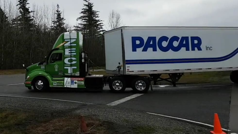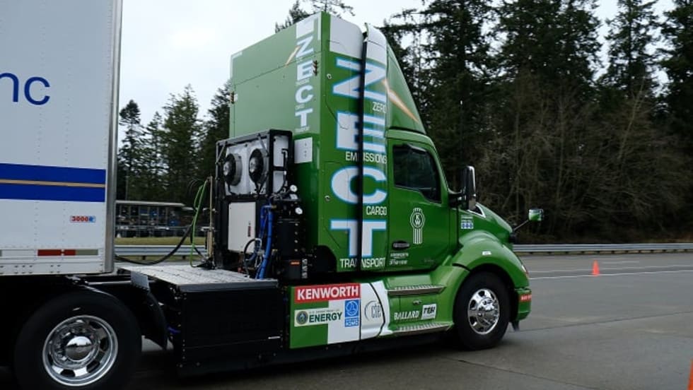 Kenworth's Zero Emissions Cargo Transport is a heavy-duty truck with a hydrogen fuel cell-powered battery-electric powertrain, capable of about 100 miles of travel fully loaded. Photos: Jim Park