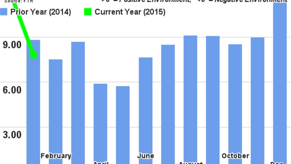 The FTR Trucking Conditions Index for January dropped 34% month to month to a reading of 7.8. Despite the drop, the index is only slightly below the high average score from 2014.