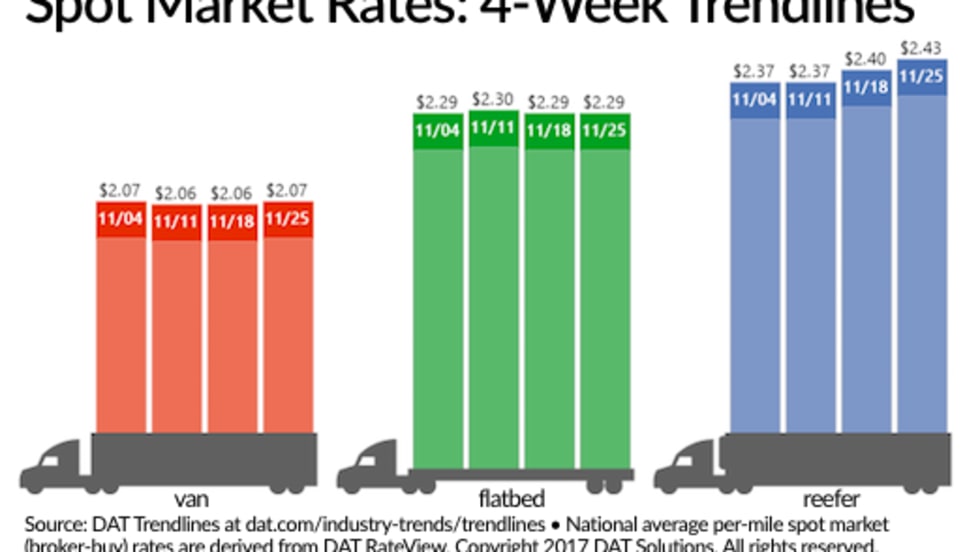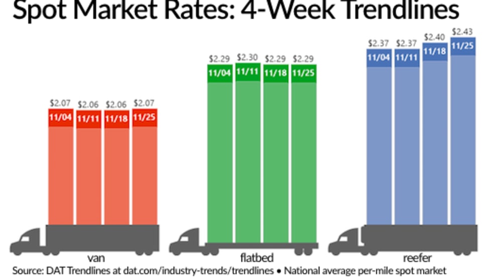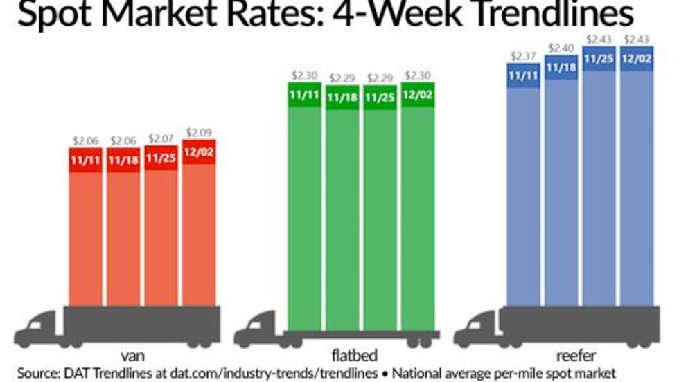 While the short Thanksgiving workweek meant fewer loads and trucks posted on the spot truckload freight market demand for capacity boosted van and refrigerated freight rates, according to DAT Solutions and its network of load boards.
