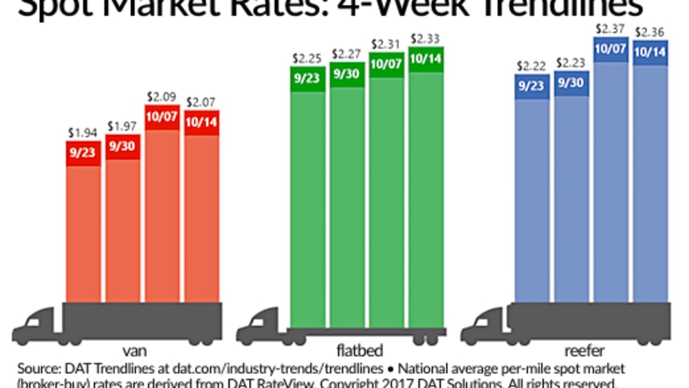 The availability of spot truckload freight fell 10% while the number of trucks posted gained 7% during the week ending Oct. 14, according to DAT Solutions and its network of load boards.