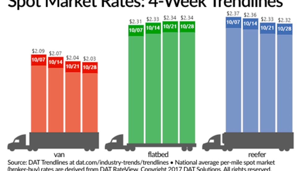 The availability of spot truckload freight dipped 1.8% while the number of trucks posted fell 2.4% during the week ending Oct. 28, according to DAT Solutions and its network of load boards.
