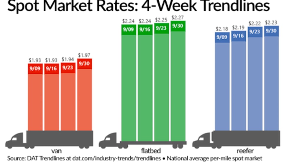 The number of available loads on the spot truckload freight market jumped 5.4% for the week ending Sept. 30 while tight capacity moved freight rates higher, according to new numbers from DAT Solutions and its network of load boards.