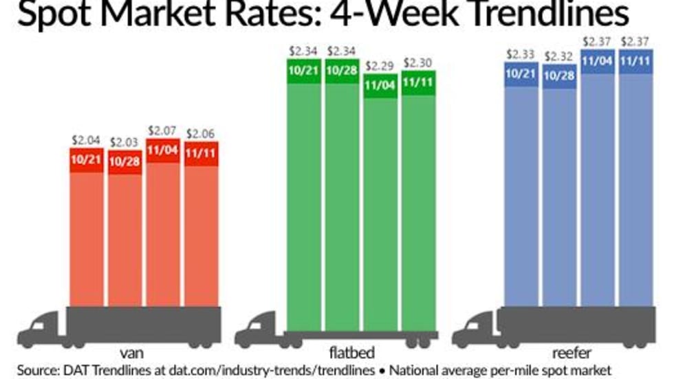 The availability of spot truckload freight gained 4.8% and the number of trucks posted slipped 3.2%, while rates remained unseasonably high, for the week ending Nov. 4, according to DAT Solutions and its network of load boards.