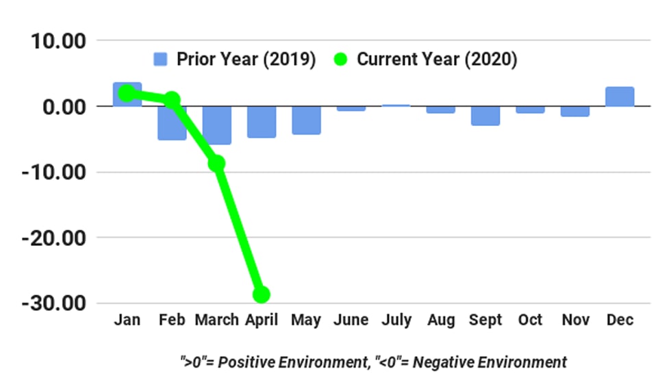 FTR’s April Trucking Conditions Index dropped to its lowest level ever at -28.66, reflecting the effects of the COVID-19 pandemic.