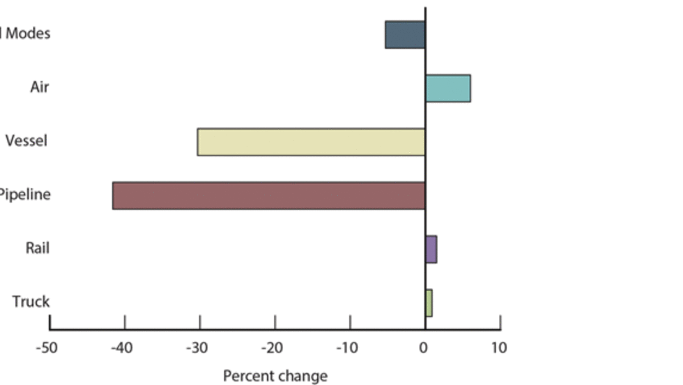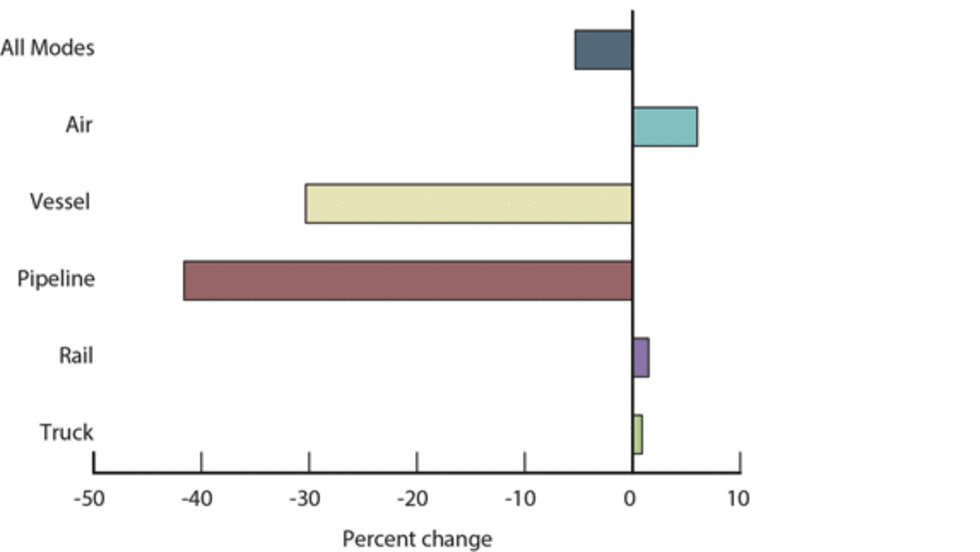 Newly released figures show the value of freight moved between the U.S. and its North American Free Trade Agreement neighbors totaled $96.1 billion in March, a 5.3% decline from a year ago, but three out of five transportation modes carried more cross-border cargo.