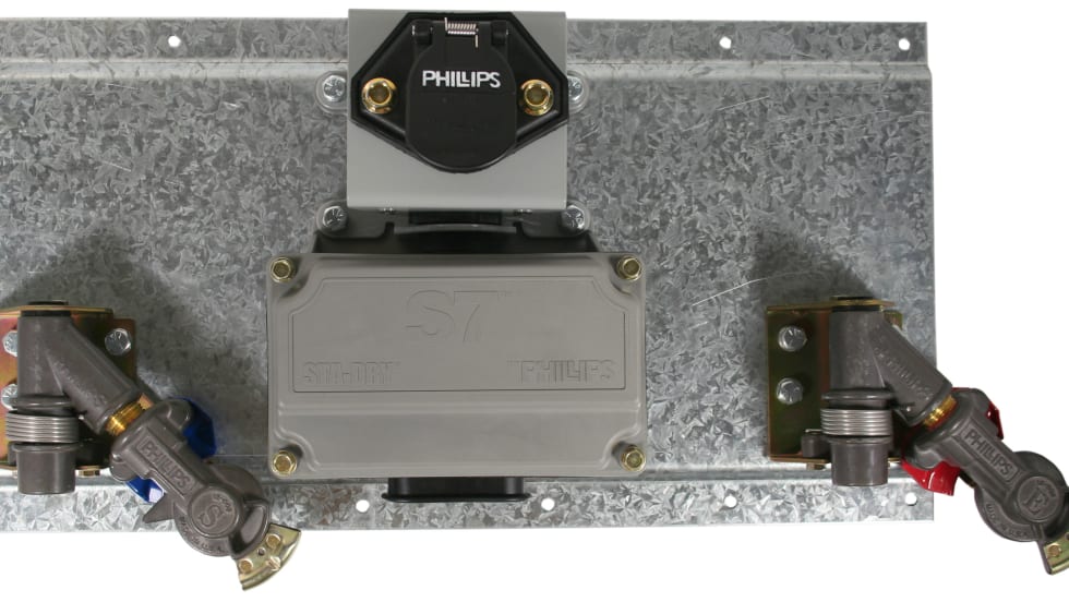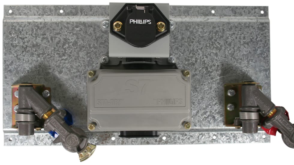 Phillips Industries has integrated its swivel S7 socket technology with its anti-corrosive swinging gladhands pre-fastened to a galvanized mounting plate to offer the new Sta-Dry S7 System.