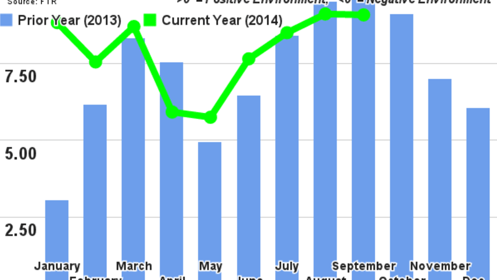 The Trucking Conditions Index from the freight transportation forecasting firm FTR registered 9.07 for September, according to a just released report.