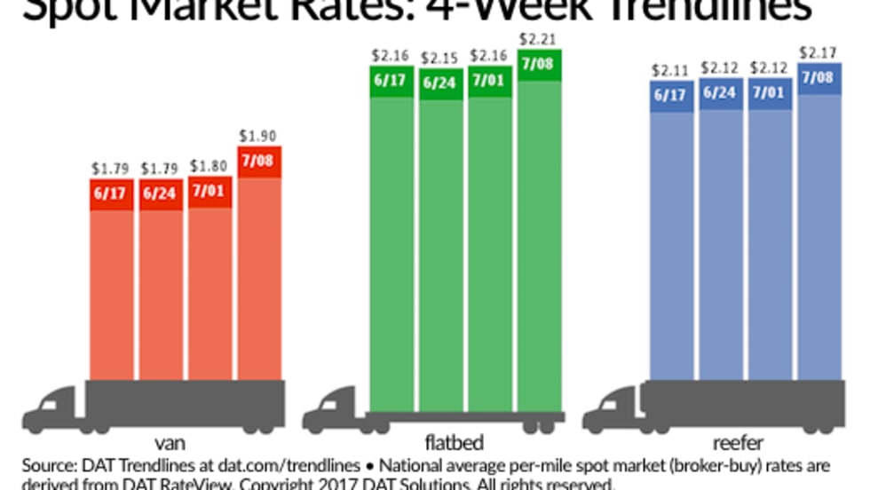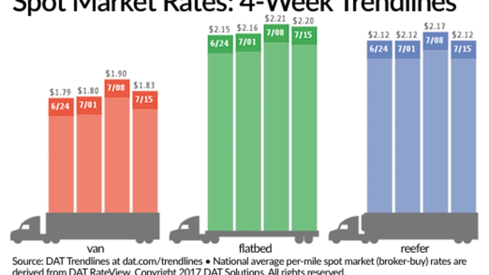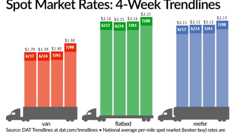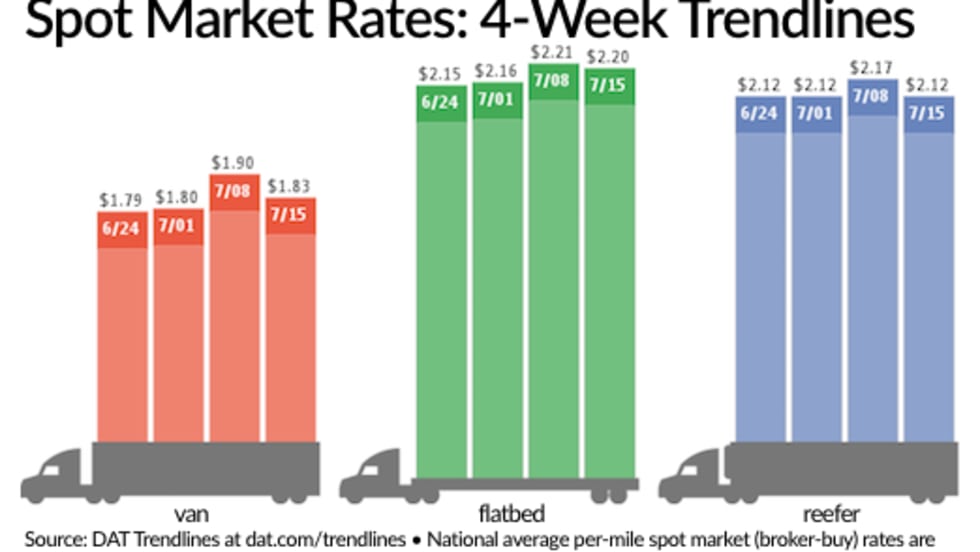An unusual surge of truckload freight led to higher-than-normal volume on the spot market for the week ending July 29, according to DAT Solutions and its network of load boards, but it failed to turn into any substantial rate increases.