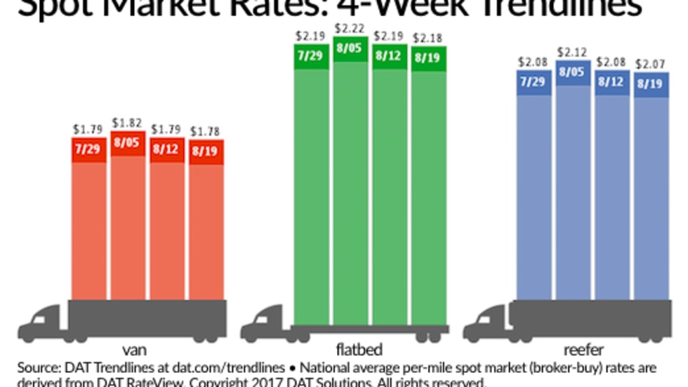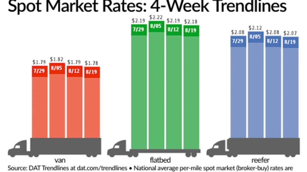 We’re supposed to be in the dog days of summer but spot market truckload freight volumes are still higher than any month except June while August had a stronger start than any month in more than a year and a half, according to DAT Solutions and its network of load boards.