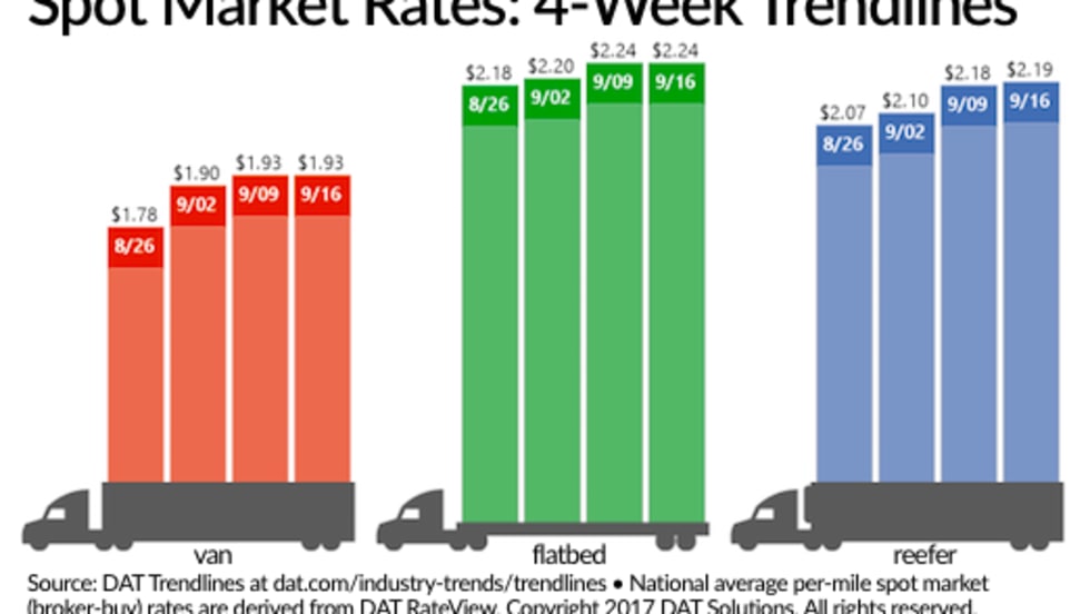 Hurricanes Harvey and Irma have come and gone but their effects on supply chains continue, according to the freight matching service provider DAT Solutions, with spot freight rates remaining at two-year highs.