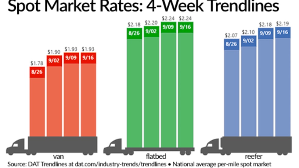 The number of available loads on the spot truckload freight market rose as freight rates moved higher again for the week ending Sept. 23, according to new figures from DAT Solutions and its network of load boards.