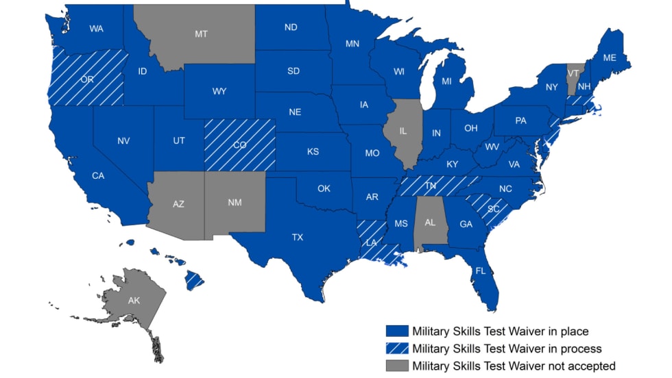 In the past two years, 34 states have adopted laws that allow motor vehicle departments to waive the CDL skills test for qualified military veterans, the Obama administration says in a new report. Nine more states plus the District of Columbia are considering legislation to do the same thing.
