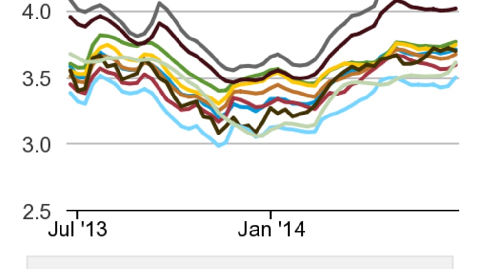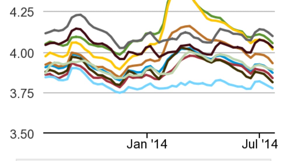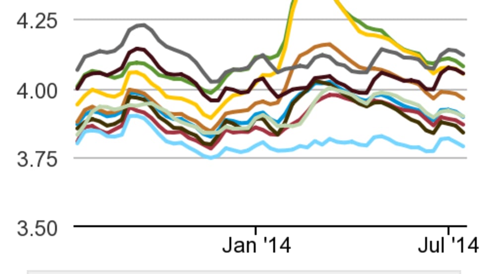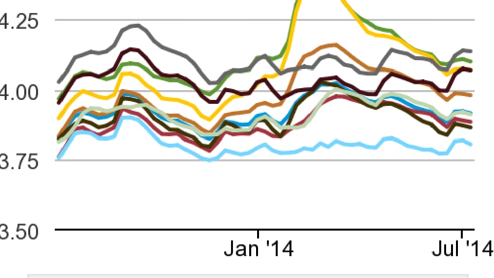 Diesel prices see a gain of one-tenth of a cent while regular-grade gasoline holds at last week's level. Crude oil prices are at their lowest in the past two weeks.