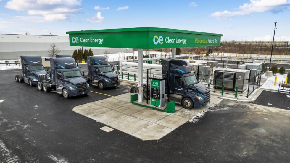 The new Clean Energy station in Romeoville, Illinois, will initially fuel about 100 Amazon trucks with low-carbon fuel as part of the company's nationwide RNG expansion.