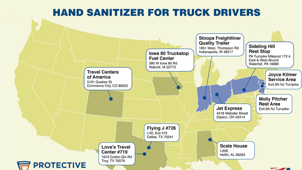 The American Trucking Associations and partner Protective Insurance Company will be supplying hand sanitizer to trucker drivers along major U.S. freight corridors.