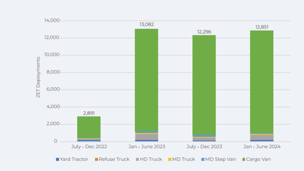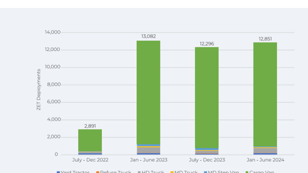 While zero-emission truck adoption continues to grow when it comes to cargo vans, deployments of zero-emission medium- and heavy-duty trucks have remained flat for 18 months, according to Calstart.