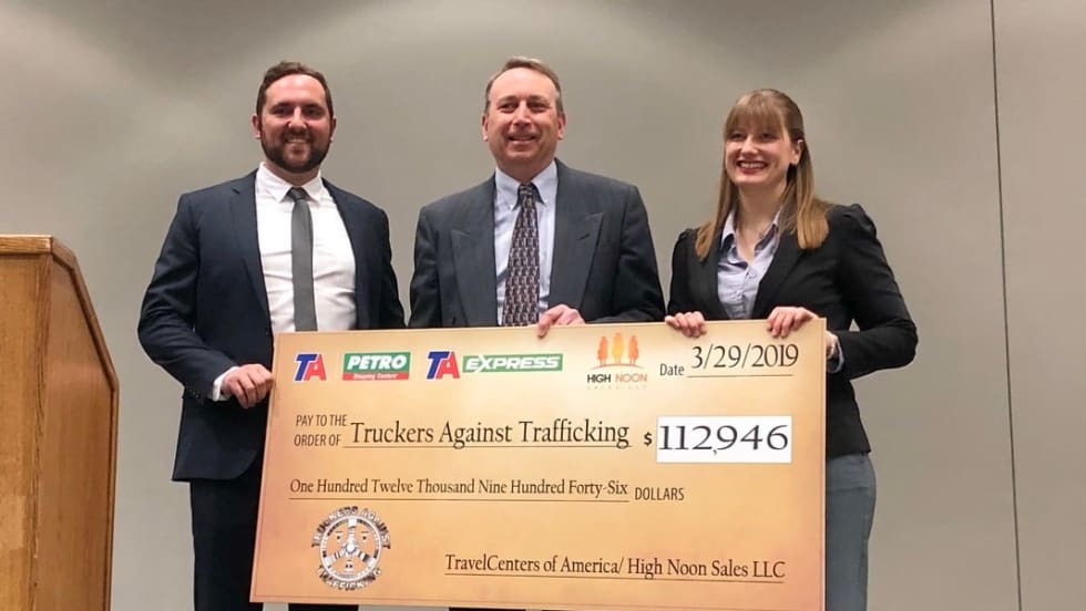 Following up on a pledge to help stem the flow of human trafficking, TravelCenters of America has donated $112,946 to Truckers Against Trafficking.