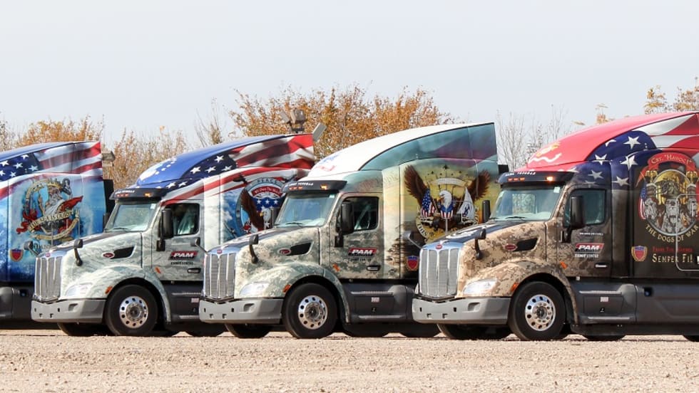 Pam Transport has sent four military-themed custom wrapped Peterbilt trucks to deliver wreaths to the Ft. Sam Houston National Cemetery in San Antonio.