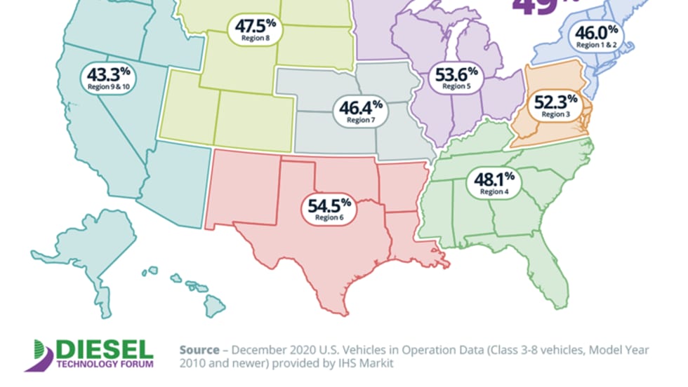 Nearly half the commercial trucks operating in EPA Regions 9 and 10 are now powered by the newest-generation of Near-Zero Emissions diesel engines, according to analysis by the Diesel Technology Forum.