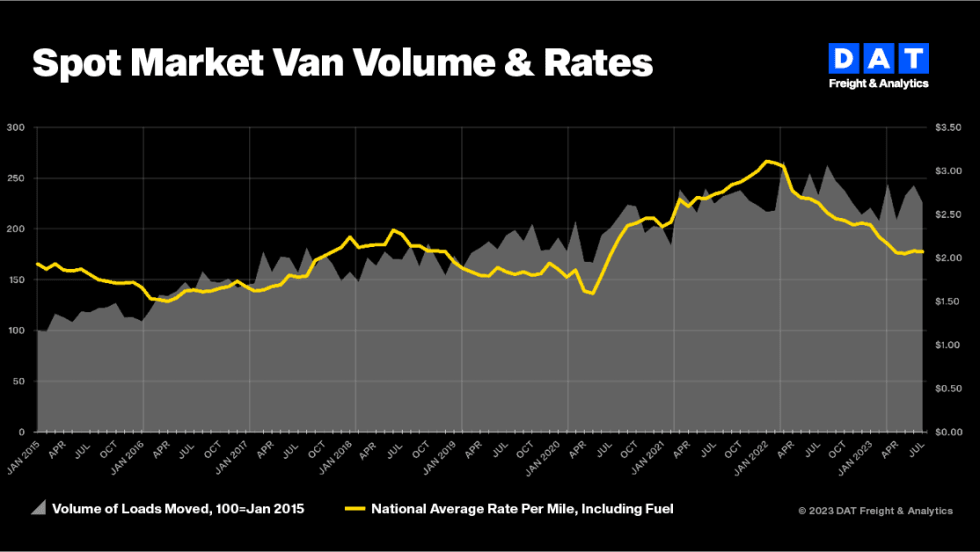 Truckload freight volumes fell last month and national benchmark spot rates for dry van and refrigerated loads retreated from their gains in June, reported DAT Freight & Analytics.