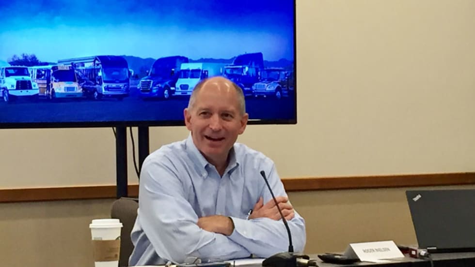 Daimler Trucks North America chief Roger Nielsen spoke about managing a runaway truck market, electric trucks, automation and more to trucking reporters at the American Trucking Associations' conference in Austin, Texas.