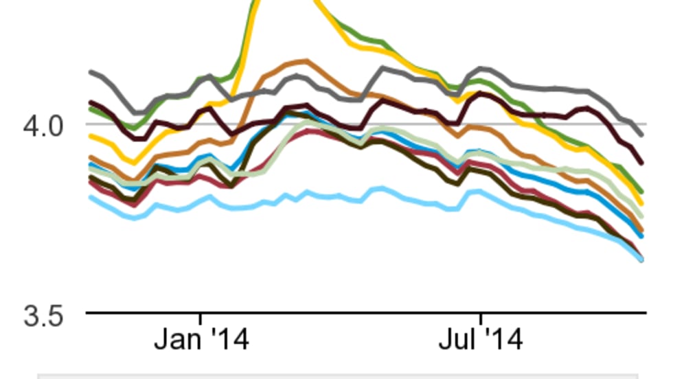 UPDATED -- Diesel fuel and gasoline prices in the U.S. continue moving lower with the national averages posting their largest weekly drops in quite a while.
