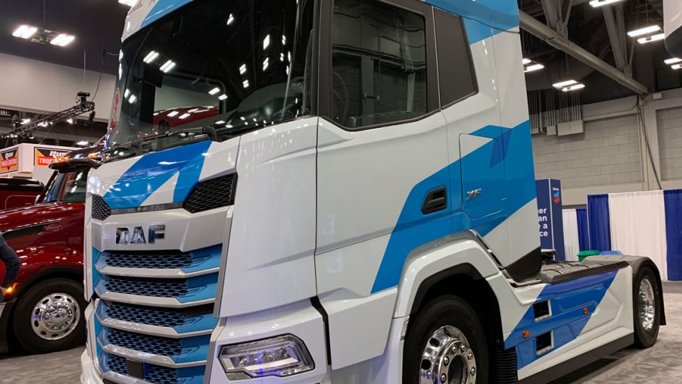 Peterbilt displayed a Euro-style high cabover truck, a demonstrator model powered by a prototype hydrogen-fueled internal combustion engine, at the American Trucking Associations annual management conference.