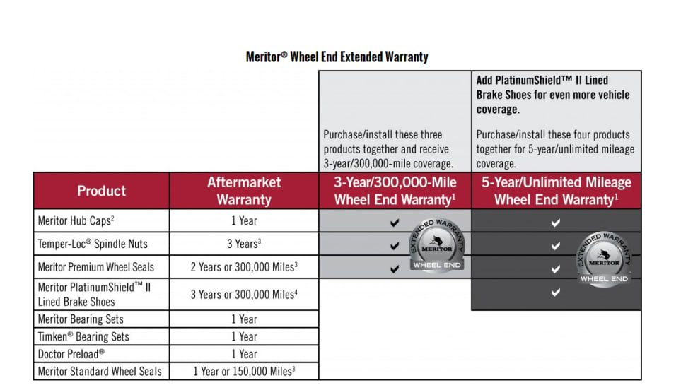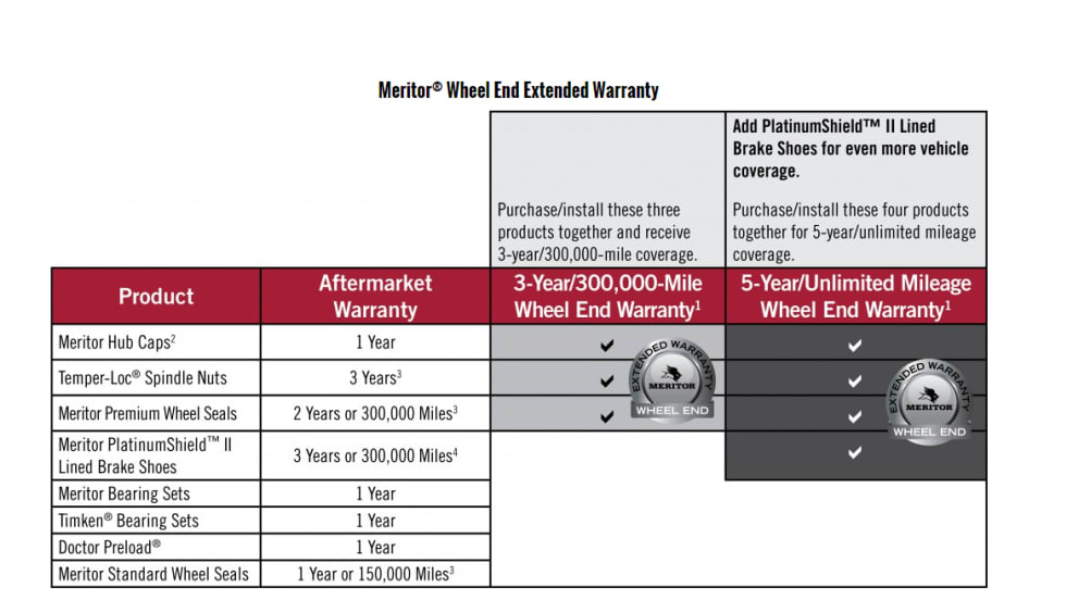 The Meritor Aftermarket Wheel End Extended Warranty program offers increased warranty coverage when complementary Meritor wheel end products are bought and installed together.
