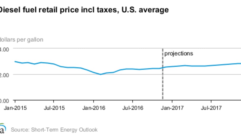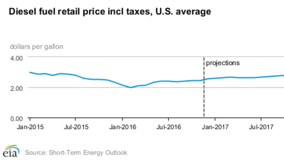 Final government forecasts for diesel, gasoline and oil prices before 2017 gets underway are in with two of the three calling for double-digit percentage hikes compared to this year.