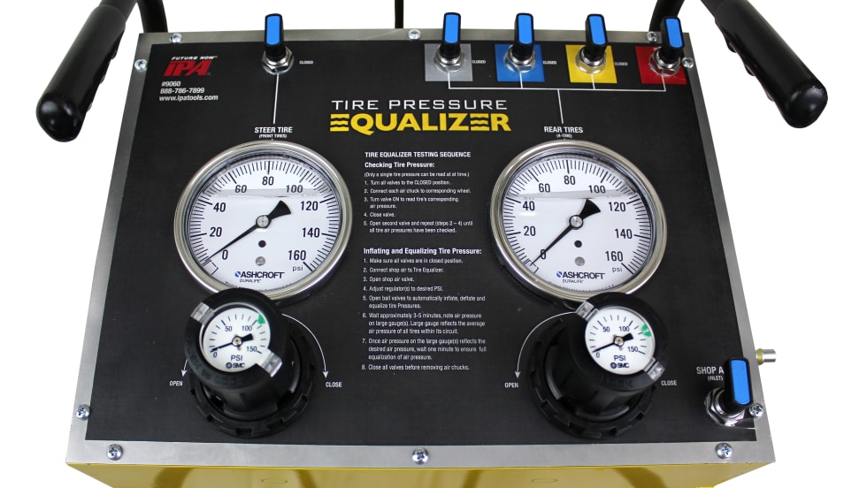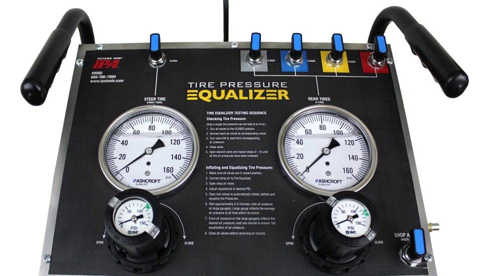 The IPA Mobile Tire Pressure Equalizer introduces a new, fast and efficient method to accurately read and inflate tire pressure on multiple tires (up to five) at the same time. IPA has launched the Equalizer to help fleets ensure they are realizing the greatest fuel economy and tire life possible to help reduce costs.