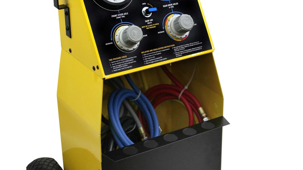 The IPA Mobile Tire Pressure Equalizer has been redesigned to include air toggle valves, an internal storage compartment, side mounted hose hangers and holsters for aftermarket air chucks.