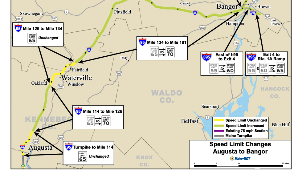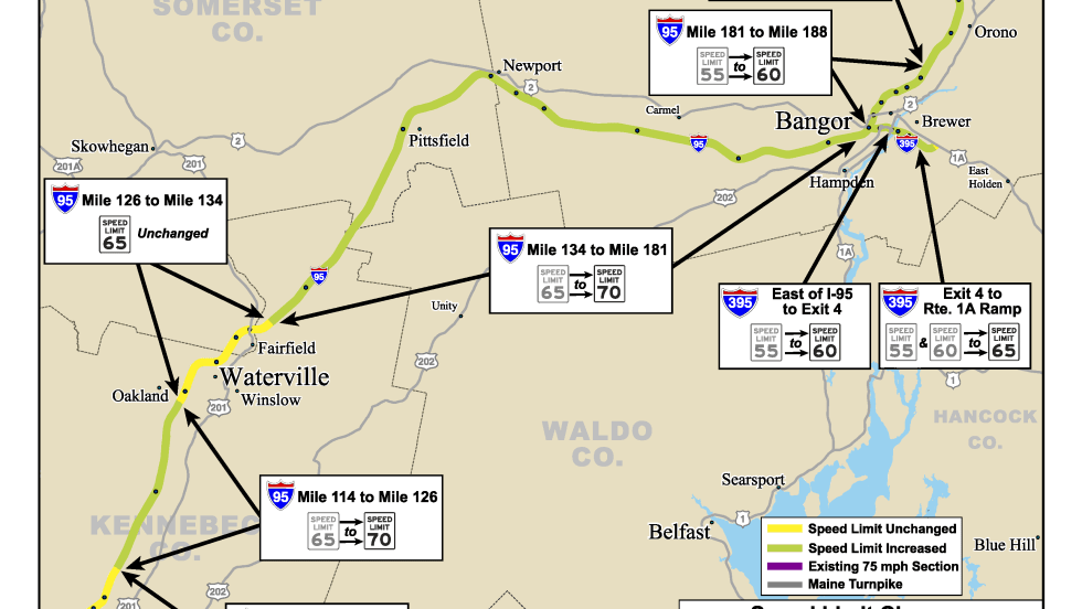 Speed limits along some Interstate routes in Maine as well as one non-Interstate route are increasing, some immediately. The move by the state transportation department follows a study of crash numbers and speeds it claims most people are already driving.