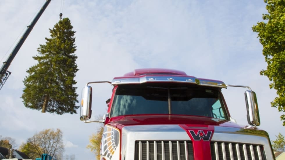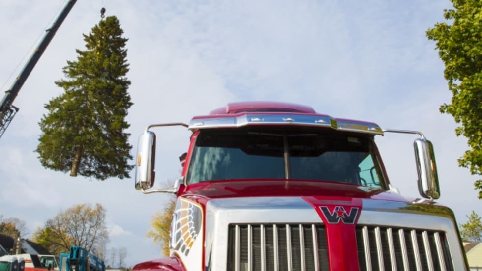 The 2018 Western Star 5700XE, which was showcased at the North American Commercial Vehicle (NACV) show in September, traveled from Atlanta to Stephenson, Mich., so a 61-foot white spruce Christmas Tree could be loaded onto a flatbed trailer and delivered to the Michigan state capital.