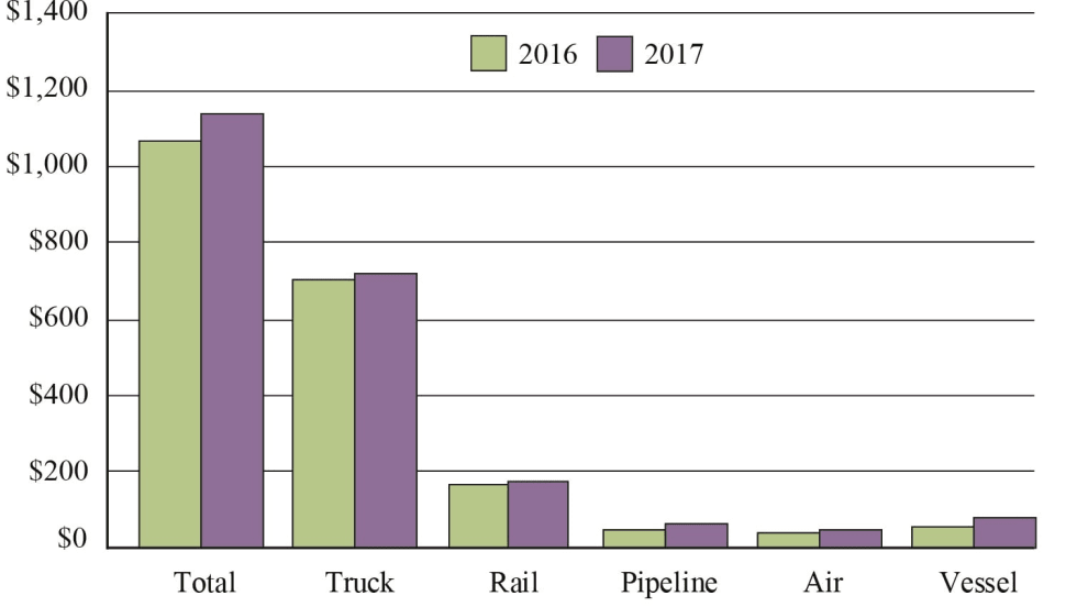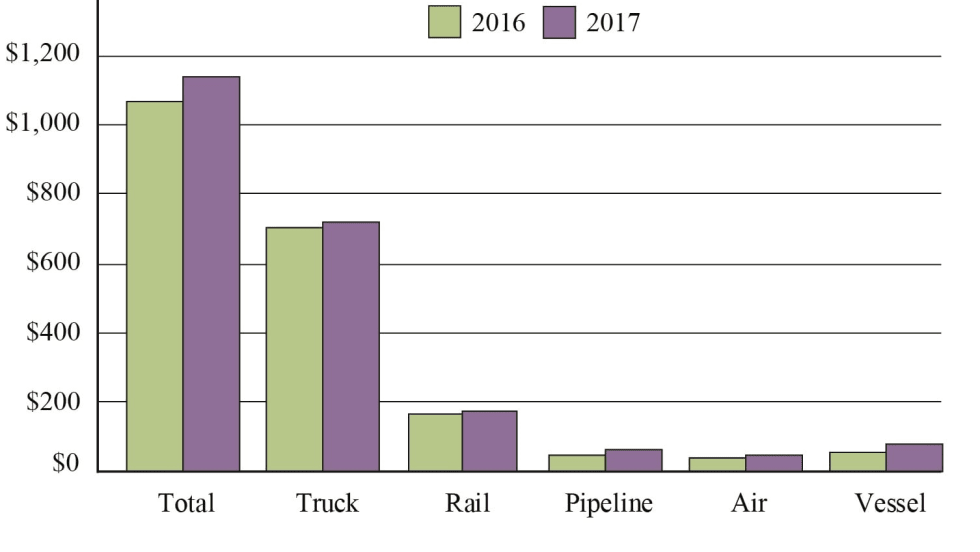 Trucking posted the biggest loss of the five major transportation modes when it came to the value of U.S. freight moved between Canada and Mexico last year, according to new Transportation Department figures.