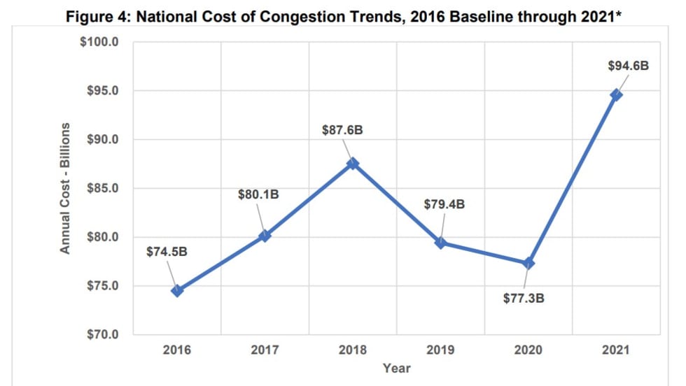 The latest Cost of Congestion study, published by the American Transportation Research Institute, reports traffic congestion cost the trucking industry $94.6 billion in 2021.