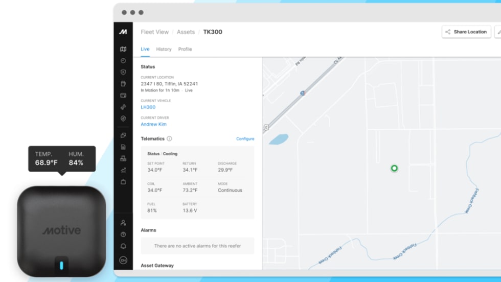 Motive Reefer Monitoring includes an environmental sensor that remotely monitors reefer temperature and humidity conditions in real-time.