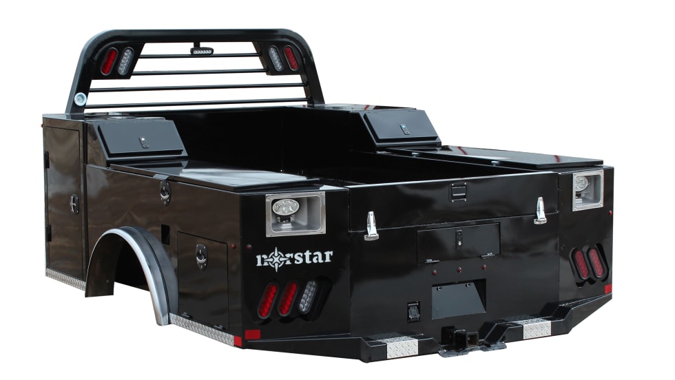 The Norstar SD Service bed is a service body with a gloss black powder coating designed for single- or dual-wheel work trucks.