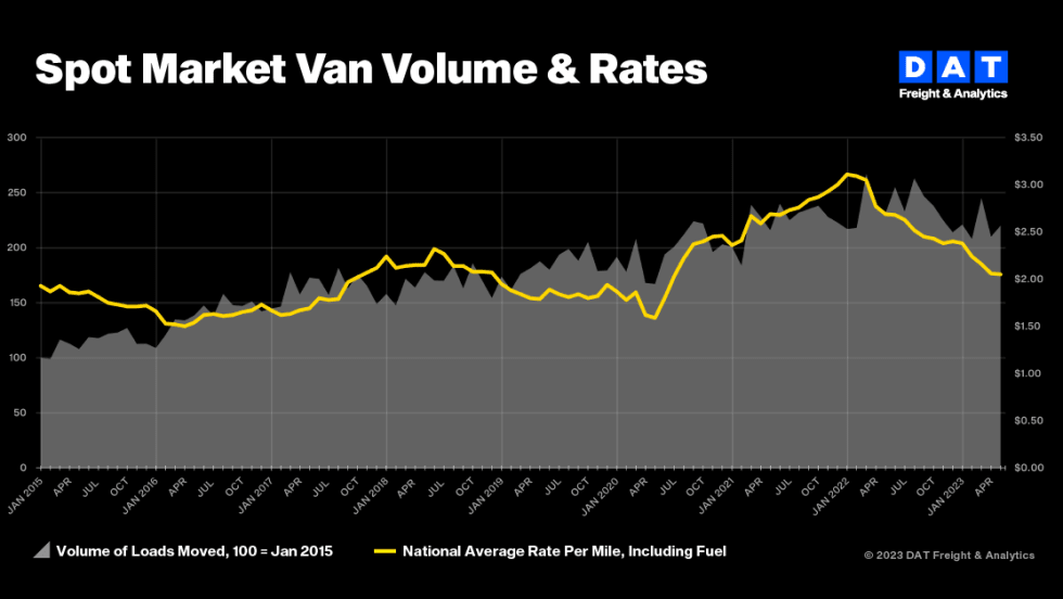 Truckload freight volumes and spot rates held firm in June, while contract rates fell to their lowest points in almost two years, said DAT Freight & Analytics.