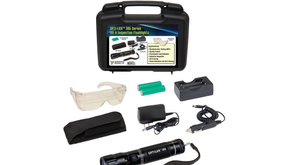 The Tracerline Optimax 365 is a cordless, rechargeable UV leak detection flashlight featuring ultra-high-flux LED technology.