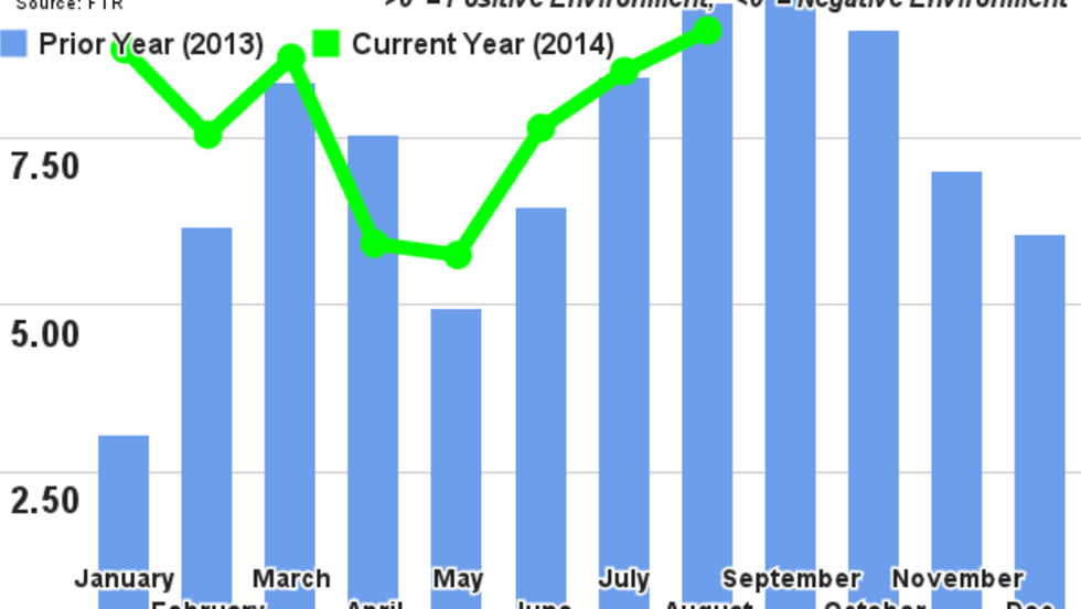 FTR’s Trucking Conditions Index increased to 9.10 in August, an upward trend that reflects a tight capacity situation for the freight market.
