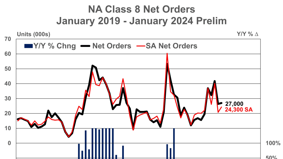 Both ACT Research and FTR reported Class 8 preliminary net orders increased in January over December 2023, but taking a broader view both noted large increases in orders compared to the same time a year ago.