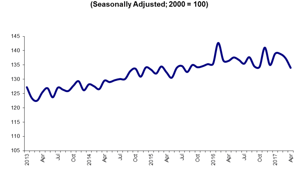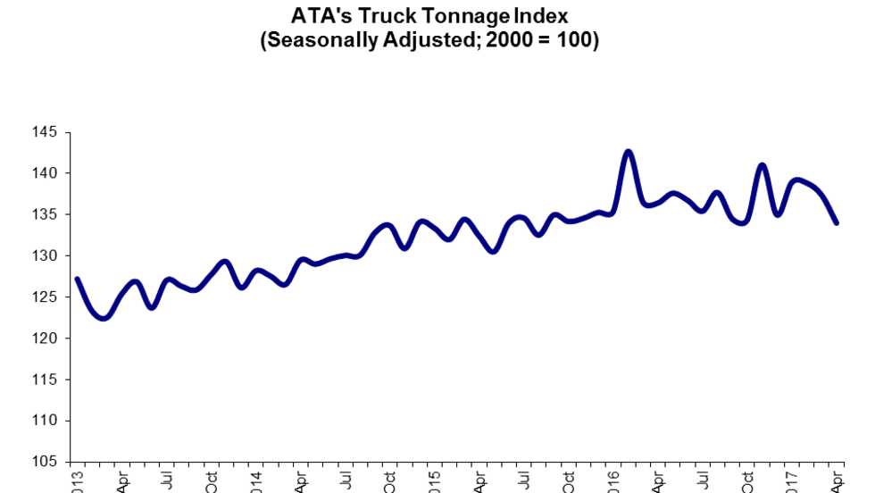 The American Trucking Associations’ advanced seasonally adjusted For-Hire-Truck Tonnage Index slid 2.5% in April, marking the third straight month of declines.