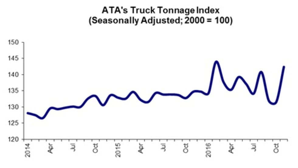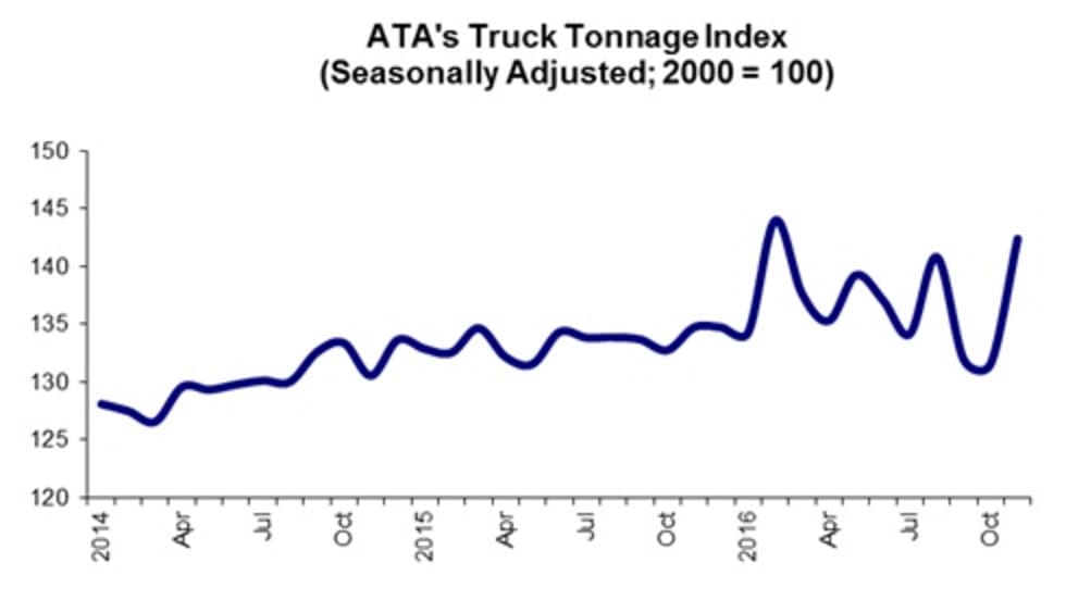 The American Truck Associations' advanced seasonally adjusted For-Hire Truck Tonnage Index spiked 8.2% in November, recovering from a slight 0.3% dip in the month before.