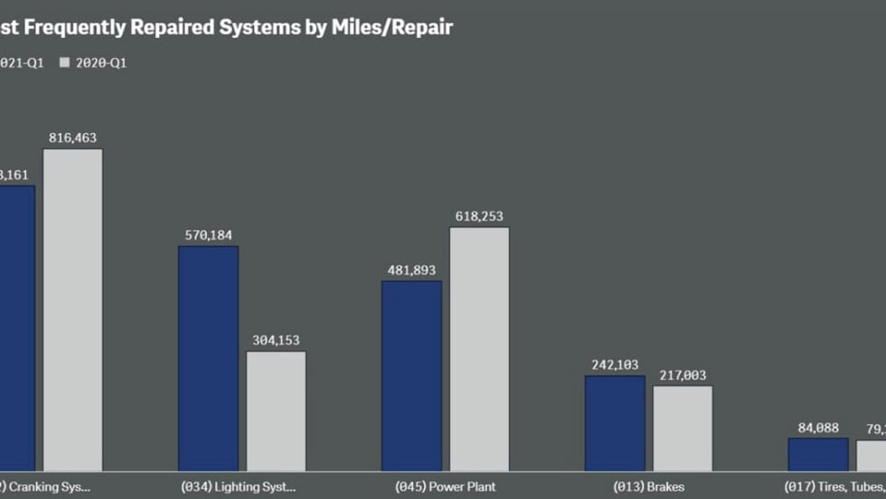 Two benchmarking reports show fleets are running more miles between breakdowns or unscheduled repairs, while the cost of parts and labor for those repairs is up.